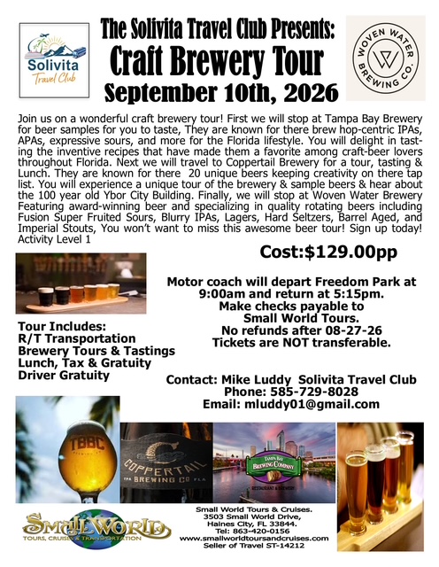 Discover the best of Florida’s craft beer scene on a relaxed and flavorful brewery tour. Begin at Tampa Bay Brewery, sampling their hop-forward IPAs, crisp APAs, and creative sours, then head to Coppertail Brewery for a guided tour, tasting, and a leisurely lunch while learning about the 100-year-old Ybor City building. Finish the day at Woven Water Brewery, enjoying award-winning beers, rotating specialty brews, and the friendly, welcoming atmosphere. Perfect for savoring unique flavors, learning local history, and enjoying a fun, social outing with fellow travelers.