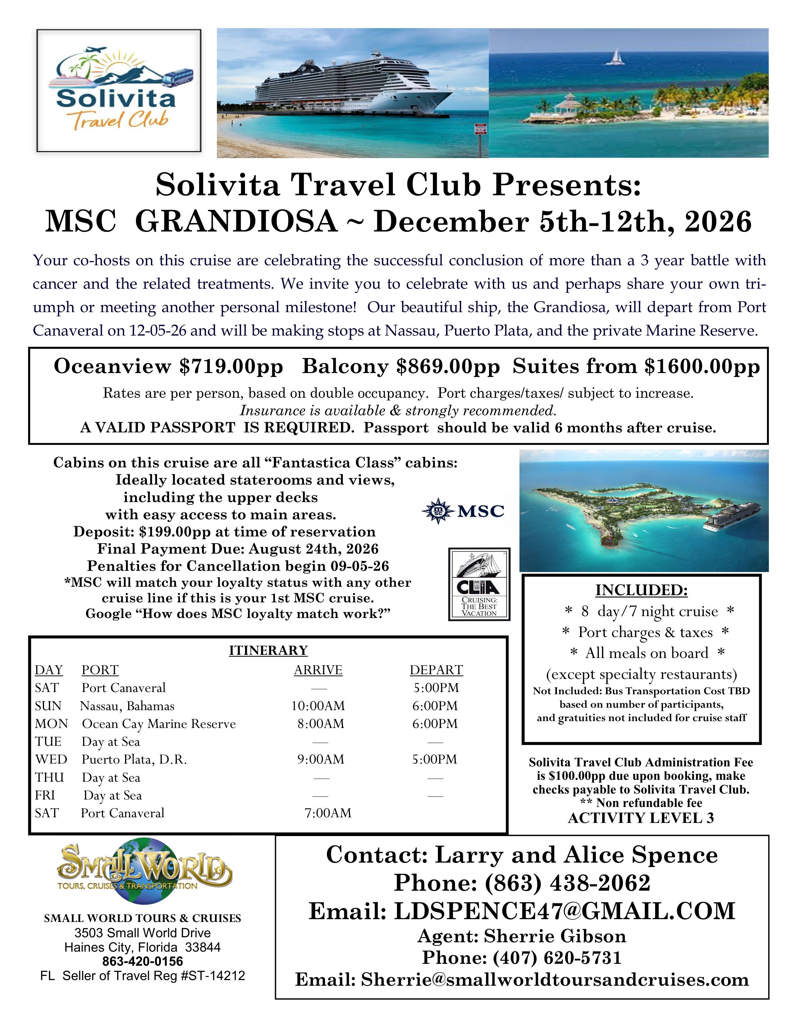 Departing from the convenient Port Canaveral, we will travel to Nassau, Bahamas for a wonderful island experience. Monday will find us at the Ocean Cay Marine Preserve for a full day visit to this interesting and beautiful nature and wildlife preserve. Rest up with a day at sea, and enjoy the amenities and grandeur of the ship. Next, Puerto Plata in the Dominican Republic, will be our next stop. A delightful and beautiful tropical island that is sure to be an interesting experience. Two day at sea will provide the start of a good tan. Explore the ship and take advantage of all it has to offer. We will dock at Port Canaveral on the morning of December 12.