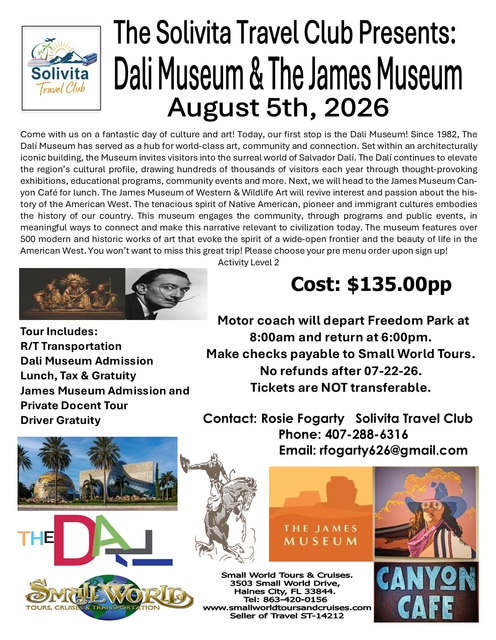 Enjoy a day of art, culture, and history on this delightful outing. Explore the surreal world of Salvador Dalí at the architecturally stunning Dalí Museum, then savor lunch before discovering the rich stories of the American West at the James Museum of Western & Wildlife Art.