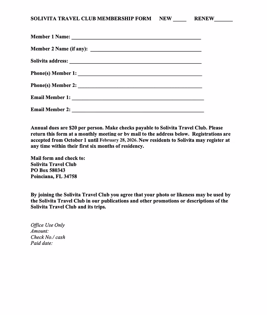 By joining the Solivita Travel Club you agree that your photo or likeness may be used by the Solivita Travel Club in our publications and other promotions or descriptions of the Solivita Travel Club and its trips.